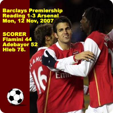 立ち上がりは、開始早々からホームのレディングが素早い攻め上がりで攻撃を仕掛けてきていましたが、一方のアーセナルはパス回しでリズムを作っていました。これが効いたのか前半3分にファブレガスのスルーパスからアデバヨールが抜け出してポストに当てる惜しいシュートを放っています。そのすぐ後にレディングのチャンス、ハーパーがスルーパスで抜け出して思い切りの良いシュートを放っていますが、これはアルムニアががっちり抑えます。これ以降は若干アーセナルが優勢ながらもレディングも踏ん張りを見せ、両者共に拮抗した試合を見せていましたが、前半終了直前にフレブのパスに飛び込んだフラミニが先制点。レディングのコーナーを抑えた後の素早いカウンターへの切り替えは見事でした。